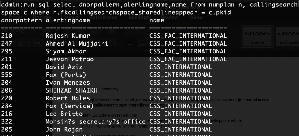 run sql select dnorpattern,alertingname,name from numplan n, callingsearchspace c where n.fkcallingsearchspace_sharedlineappear = c.pkid