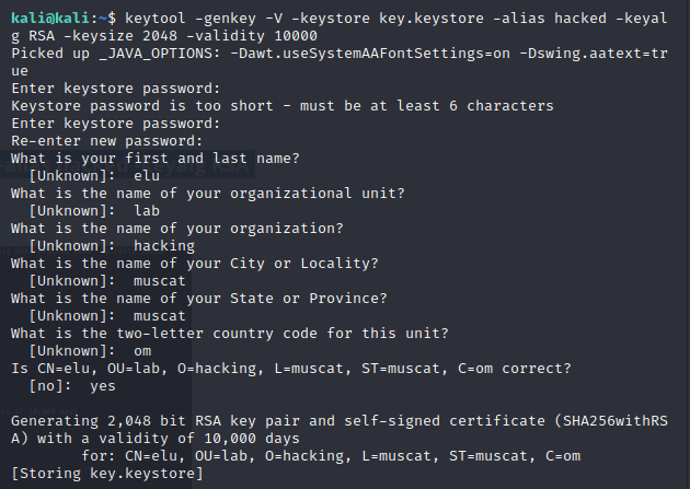 keytool -genkey -V -keystore key.keystore -alias hacked -keyalg RSA -keysize 2048 -validity 10000