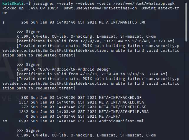 jarsigner -verify -verbose -certs /var/www/html/whatsapp.apk