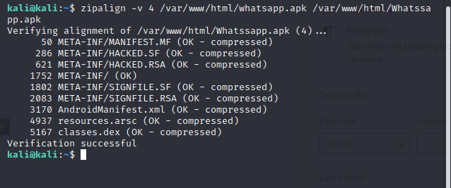 Now we have signed our android_shell.apk file successfully and it can be run on any Android environment. Our new filename is Whatssappapk after the verification with Zipalign.