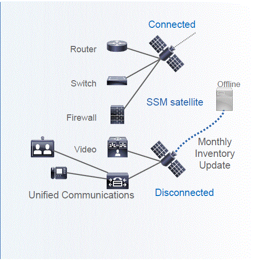 For customers who, either for policy or network reachability reasons, do not want to manage their Cisco products directly using Cisco Smart Software Manager residing at software.cisco.com, they can choose to install Cisco Smart Software Manager satellite on-premises. Devices or software product are registered and report license consumption to the Smart Software Manager satellite as though it were a replicate of the Cisco Smart Software Manager hosted within the customers premises.