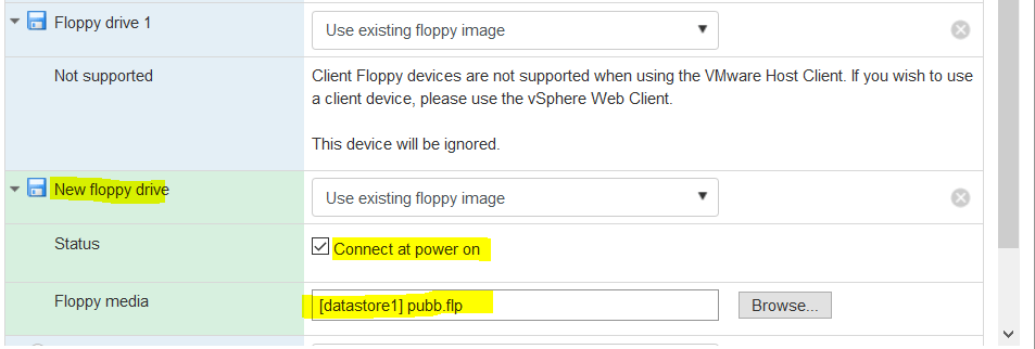 Workaround will be add a new Floppy drive and use the floppy disk image which we uploaded to the datastore. Also Mount the Installation media on your CD-Drive.