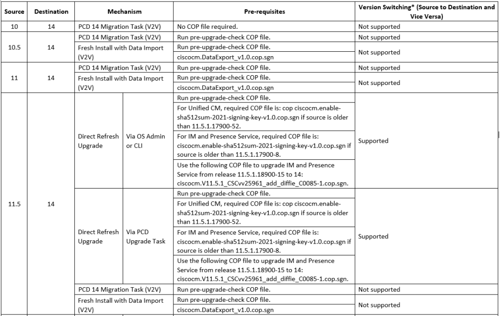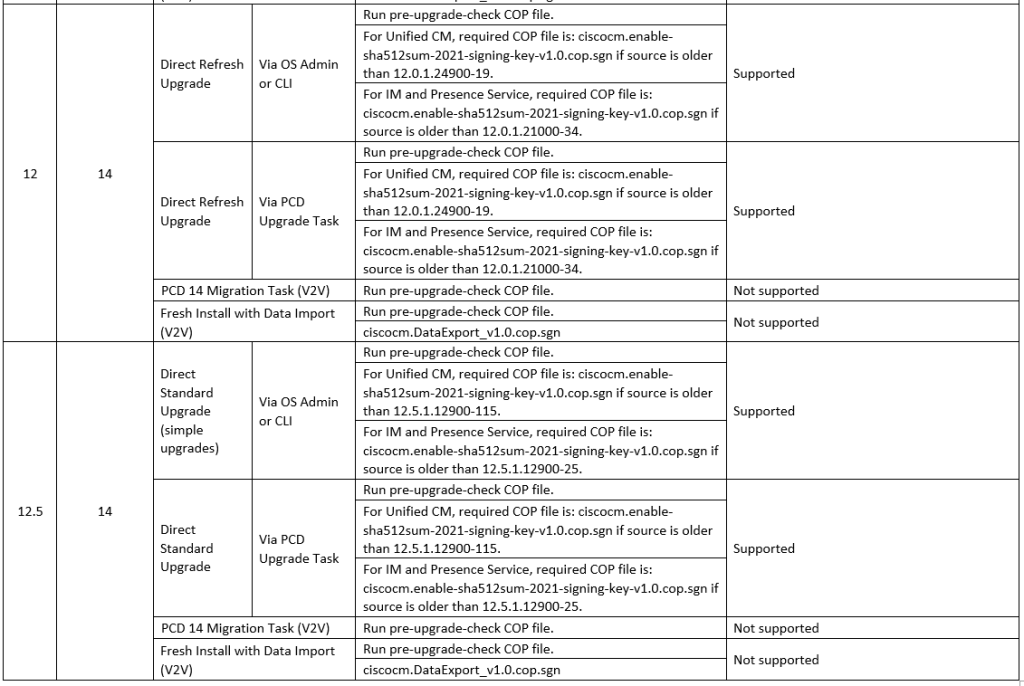 The following table highlights supported upgrade paths to upgrade to Release 14 of Cisco Unified Communications Manager and the IM and Presence Service. It also lists the upgrade paths that require COP files. You must install COP files on each node before you begin an upgrade using the Cisco Unified OS Admin interface, or before you begin an upgrade or migration using the Prime Collaboration Deployment (PCD) tool. If you are using PCD, you can perform a bulk installation of the COP files before you begin the upgrade.