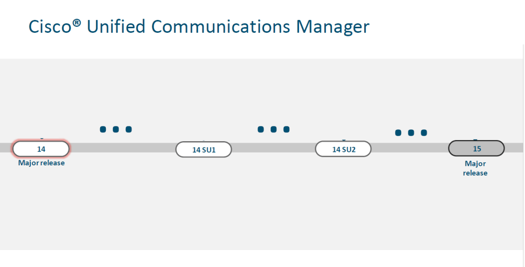 CUCM No More .0 and .5 Mainline Releases Posted by Nithin Eluvathingal on April 21, 2021April 21, 2021 If you are expecting CUCM 14.5 , there is no more Minor version (Long Life Releases).From version 14 you will be moving to V15. But Service Updates(SU’s) will be released. So if you have any plan to upgrade your CUCM, don’t wait for 14.5 Share this: Click to share on Facebook (Opens in new window) Facebook Click to share on WhatsApp (Opens in new window) WhatsApp Click to share on LinkedIn (Opens in new window) LinkedIn Click to share on X (Opens in new window) X Click to email a link to a friend (Opens in new window) Email Like Loading... Related