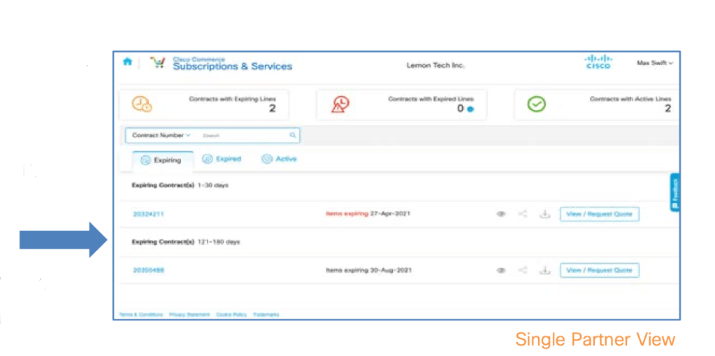 - EXPIRING TAB: quickly view your Expiring Contract status and details by Cisco Partner; see contract details and reveal the View/Request Quote button
