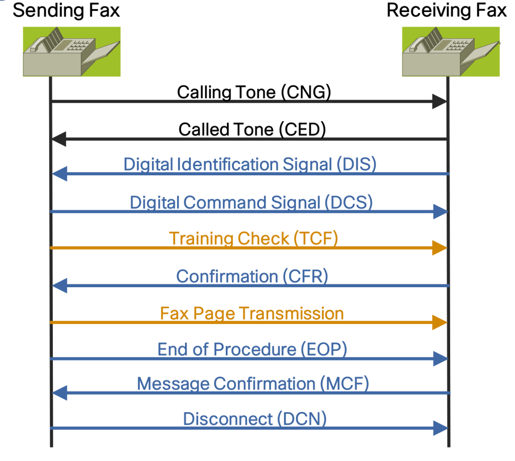 • Blue messages indicate low speed T.30 signaling and gold messages represent higher speed modulations used in training and page transmission