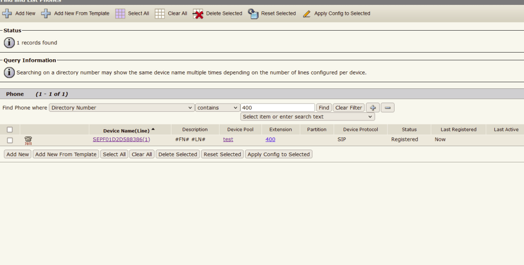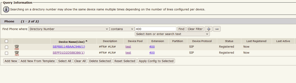 In this example, I will replace my 7811 phone with a new 7841 and choose the “Retain Existing Phone” option in the enterprise parameter. After migration, I will see two devices with extension 400.