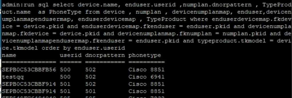 run sql select device.name, enduser.userid ,numplan.dnorpattern , TypeProduct.name as PhoneType from device , numplan , devicenumplanmap, enduser,devicenumplanmapendusermap, enduserdevicemap , TypeProduct where enduserdevicemap.fkdevice = device.pkid and enduserdevicemap.fkenduser = enduser.pkid and devicenumplanmap.fkdevice = device.pkid and devicenumplanmap.fknumplan = numplan.pkid and devicenumplanmapendusermap.fkenduser = enduser.pkid and typeproduct.tkmodel = device.tkmodel order by enduser.userid