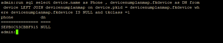 run sql select device.name as Phone , devicenumplanmap.fkdevice as DN from device LEFT JOIN devicenumplanmap on device.pkid = devicenumplanmap.fkdevice where devicenumplanmap.fkdevice IS NULL and tkclass =1