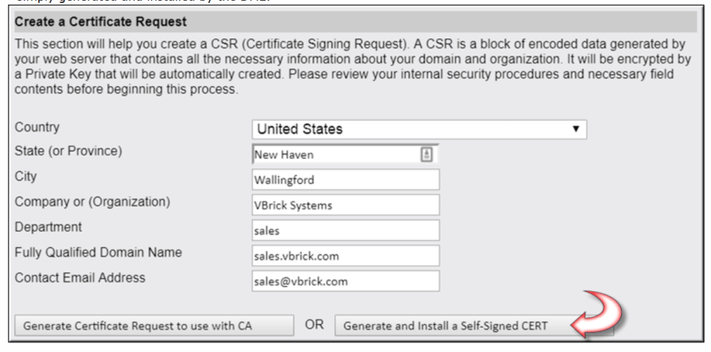 In the case of self-signed certificates, select the Generate and Install a Self-Signed CERT button and the certificate is simply generated and installed by the DME.
