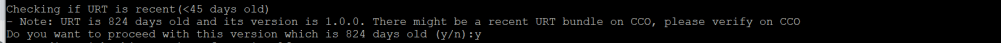 You might notice that sometimes the URT age is old. As long as the bundle is the latest one downloaded from Cisco’s website, it is ok to proceed further. The latest URT bundles can also be more than 45 days old. Type Y in order to proceed.