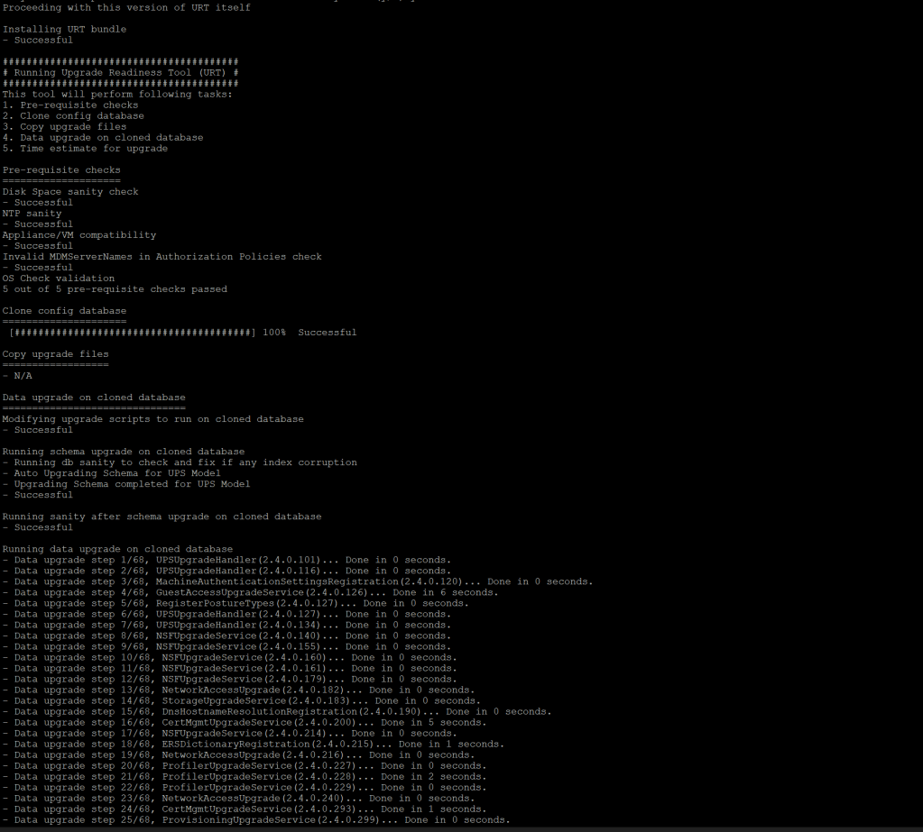 Use the URT in order to detect and fix any configuration data upgrade issues before you start the upgrade process. Most of the upgrade failures occur because of configuration data upgrade issues. The URT validates the data before the upgrade in order to identify, and report or fix the issue, wherever possible. The URT is available as a separate downloadable bundle that can be run on a Secondary Policy Administration node or standalone node. There is no downtime to run this tool.