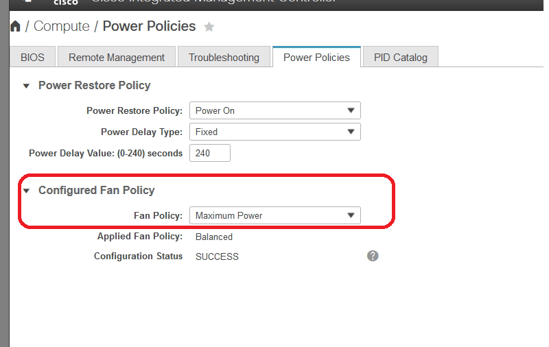 By default UCS 240 ships with Configured Fan Policy Maximum Power. This will force the Fans to run with full RPM.