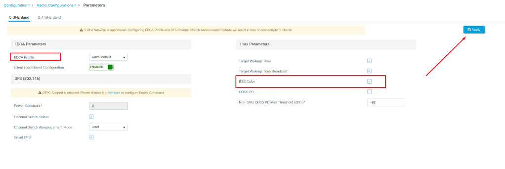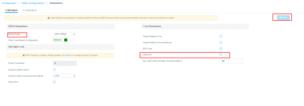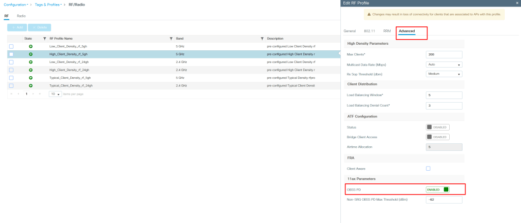 You cannot edit the default RF profiles, create a new one and Select the Profile >> go to advanced and toggle ENABLED.