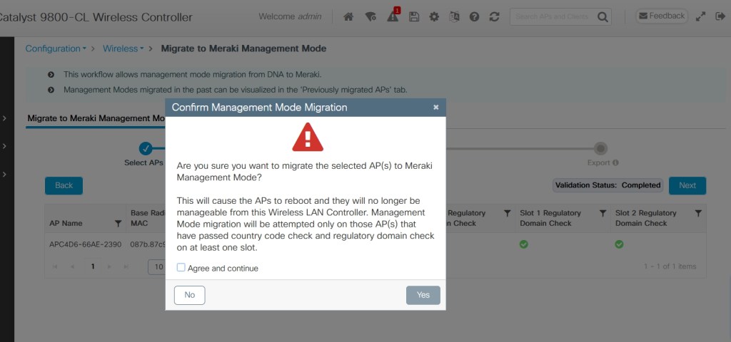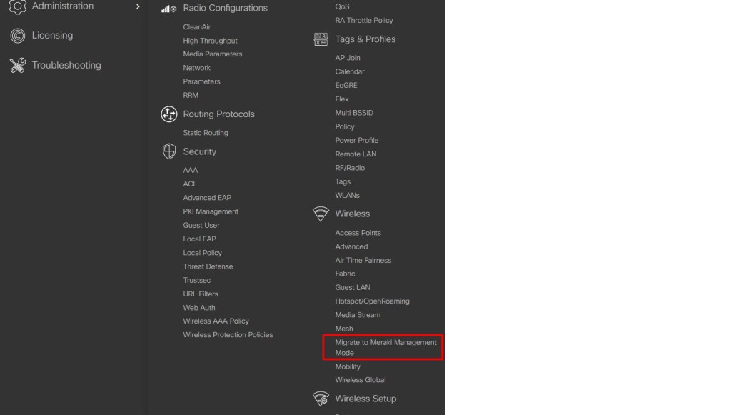 - Go to Configure > Wireless > Migrate to Meraki Management Mode