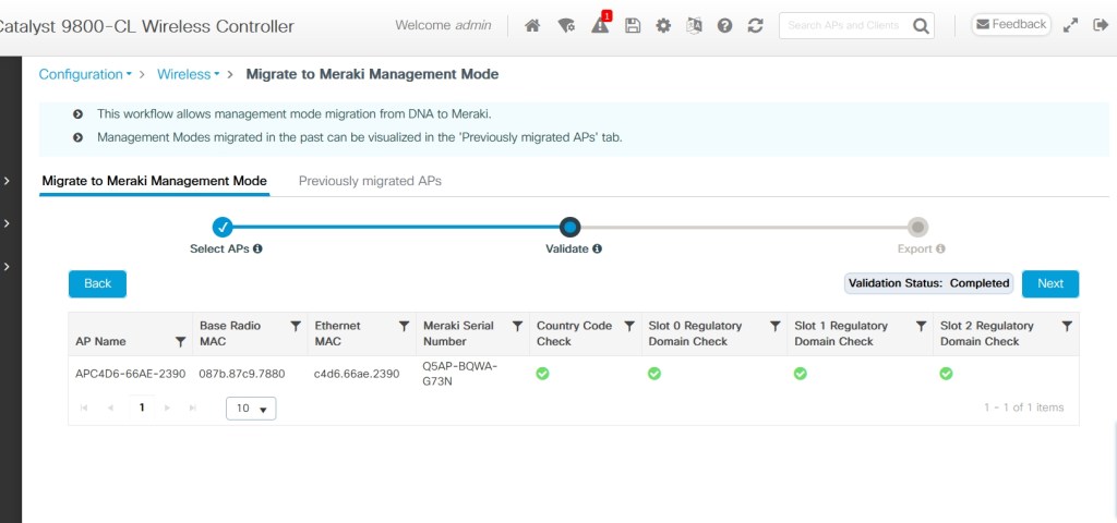- Click Migrate to Meraki Management Mode and wait for the validation check. If all checks are green, click Next.