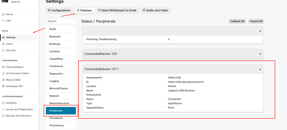 or from the Web under Status and in Peripherals > ConnectedDevice.