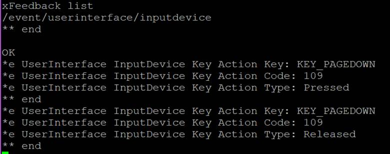 ā xapi.command(‘UserInterface Message Alert Display’, {‘Title’: ‘Remote Control Warning’, ‘Text’:’This button is not in use yet. To program it use the “Key: ‘ + event.Key + ‘ (or Code: ‘ + event.Code + ‘)’, ‘Duration’: 2}); ā